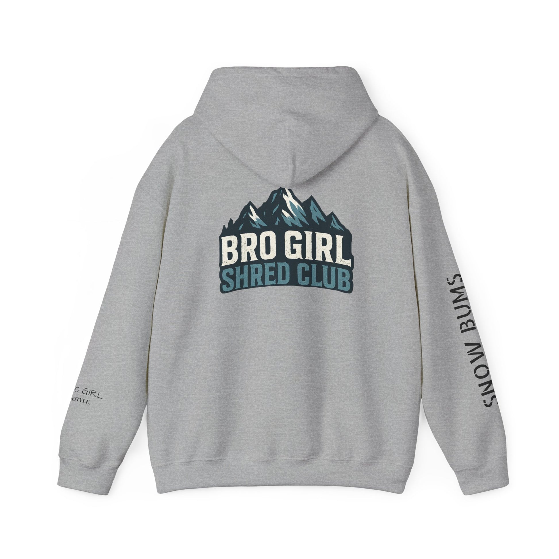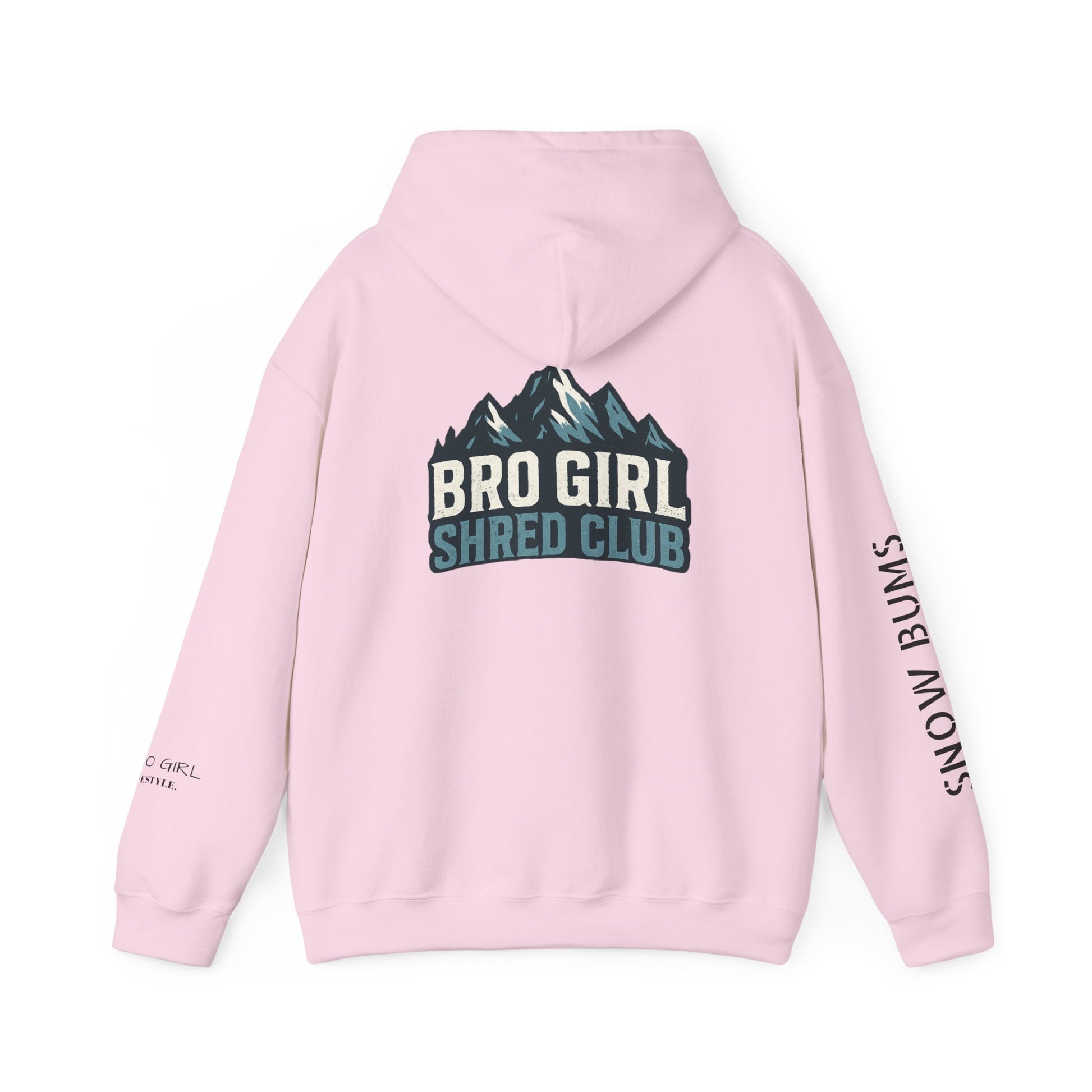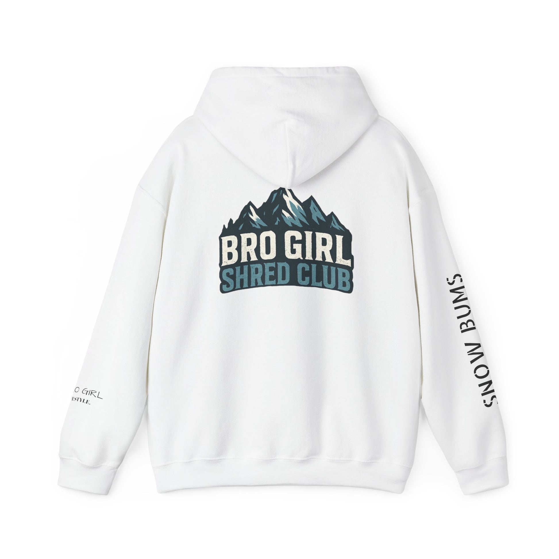 Embrace your inner snow bum with the Bro girl lifestyle SHRED university Alumni hoodie, where cozy meets cool. Designed for the girls who'd rather chase powder than perfection, this minimalist snowboard hoodie features bold varsity lettering, a clean monochrome look, and our signature Bro Girl Lifestyle touch. Perfect for apres ski hangs, mountain days, or lazy sundays. it's made for those who live life full send no matter the weather.