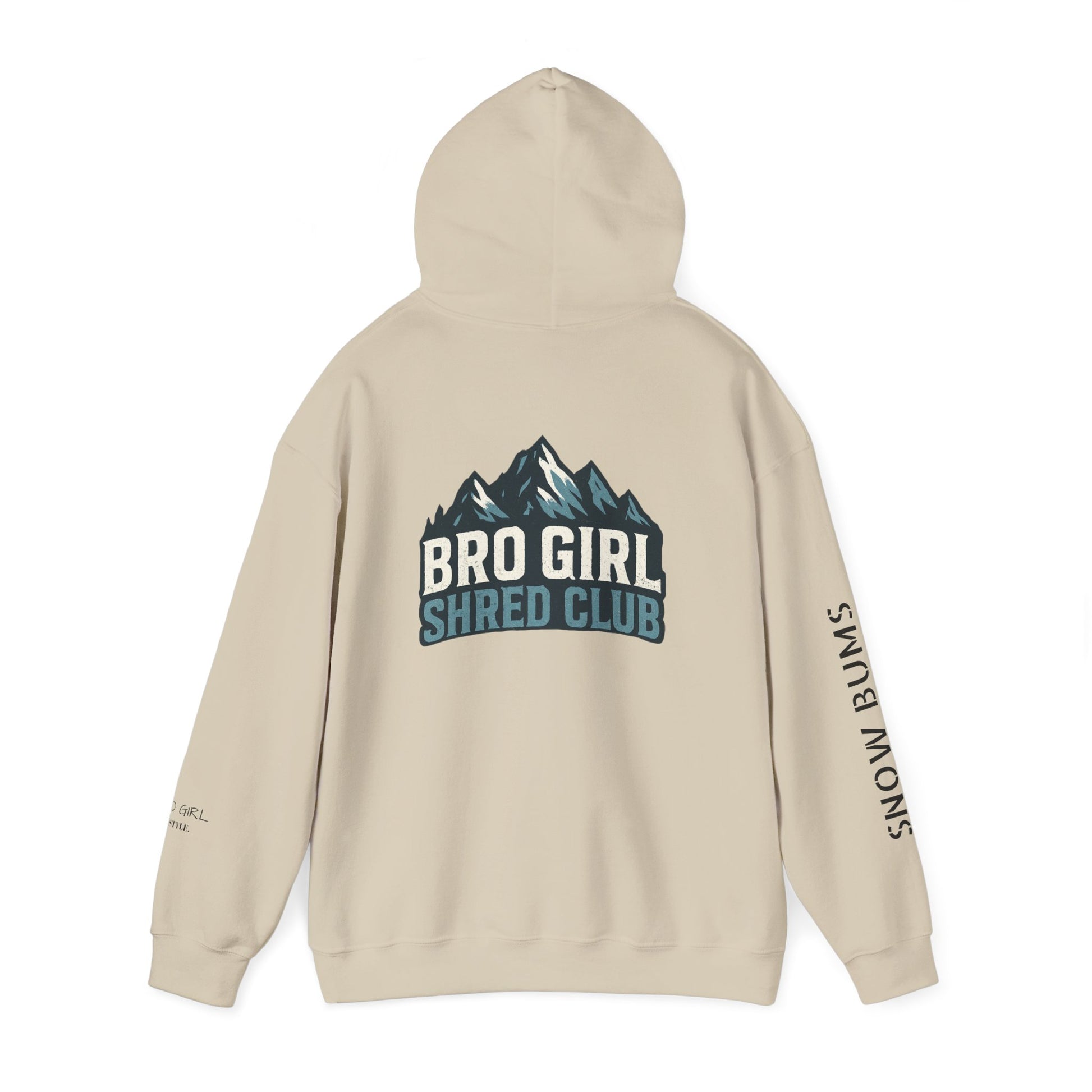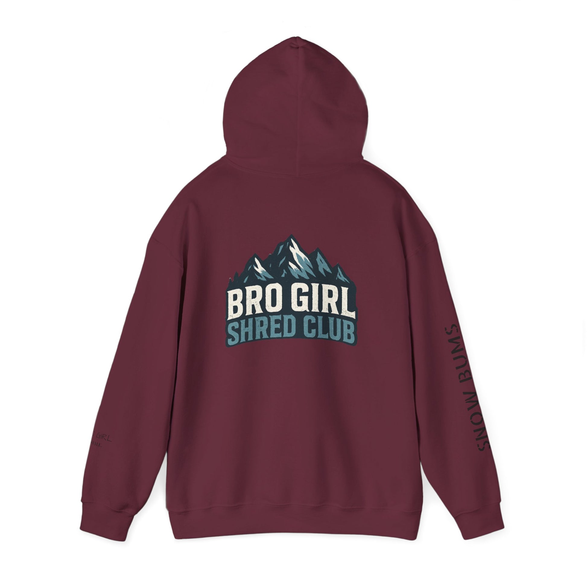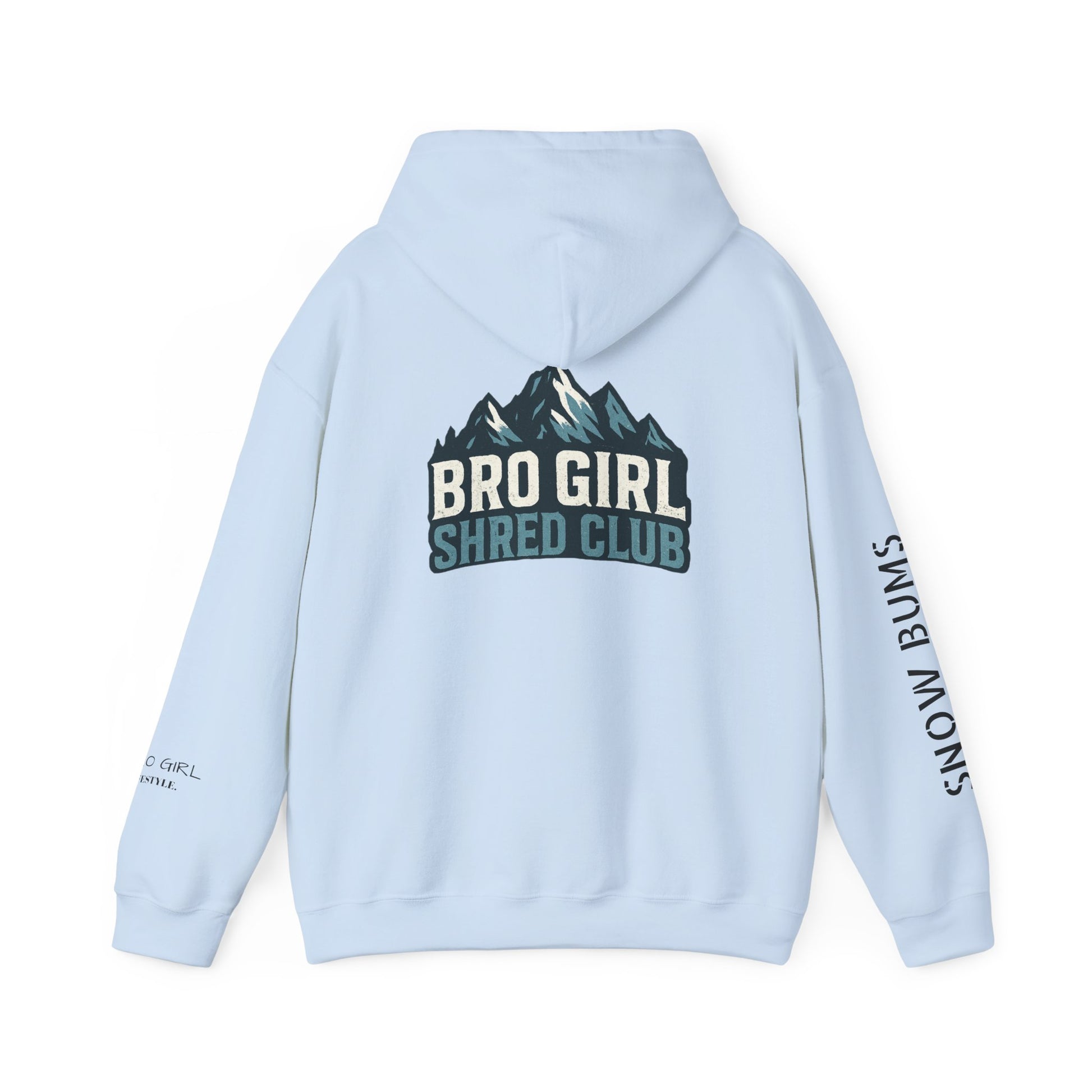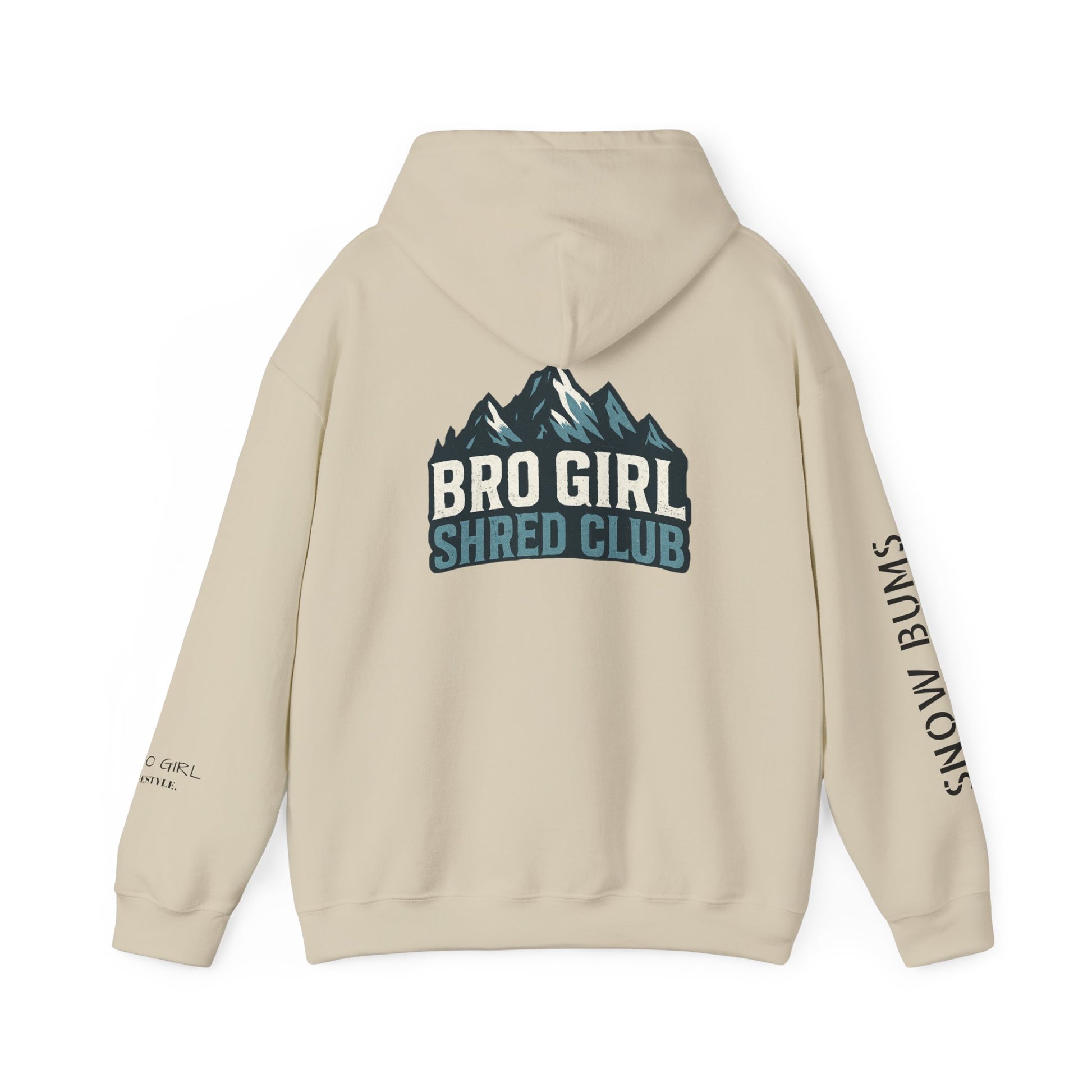 Embrace your inner snow bum with the Bro girl lifestyle SHRED university Alumni hoodie, where cozy meets cool. Designed for the girls who'd rather chase powder than perfection, this minimalist snowboard hoodie features bold varsity lettering, a clean monochrome look, and our signature Bro Girl Lifestyle touch. Perfect for apres ski hangs, mountain days, or lazy sundays. it's made for those who live life full send no matter the weather.